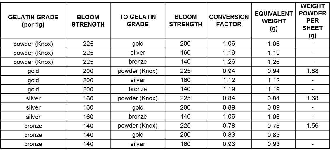 Chuyển đổi giữa chúng không chỉ dựa trên trọng lượng mà còn phụ thuộc vào độ nở (Bloom) của gelatin. Chẳng hạn, 1 gói gelatin dạng bột 7g tương đương với 3 lá gelatin bạc. Đối với gelatin Knox với độ nở cao hơn, bạn cũng sẽ cần điều chỉnh liều lượng cho phù hợp.