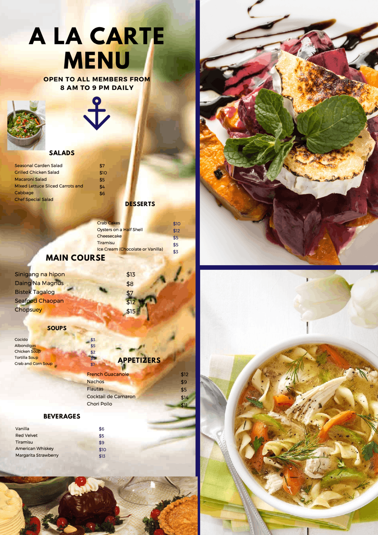Khi đến món chính, cơm chiên Dương Châu và Canh Chua Cá là hai món ăn nổi bật, với sự hòa quyện của các nguyên liệu tươi ngon. Ngoài ra, một vài món ăn phụ như gỏi củ hủ dừa hay khoai tây nghiền tỏi cũng làm phong phú thêm bữa ăn. Như vậy, thực đơn À La Carte không chỉ mang đến sự phong phú trong lựa chọn mà còn đảm bảo mỗi món đều là một trải nghiệm tuyệt vời cho thực khách.