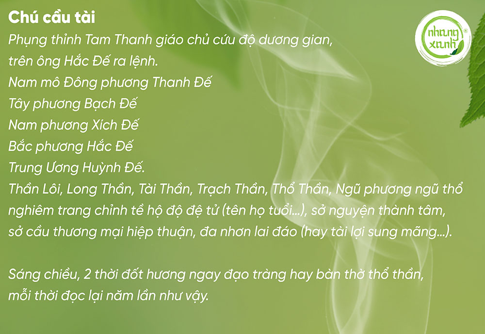 Khi ánh sáng ban mai chiếu rọi, thắp ba nén nhang và thổi bé những lời cầu nguyện. Lời khấn từ trái tim, bắt đầu với “Nam mô A Di Đà Phật!” và tiếp theo là những câu kính lạy Ngài Thần Tài, Ngài Thổ Địa. Điểm thêm chút tâm linh, gia chủ có thể cảm nhận được sự hiện diện và chở che của các vị thần trong từng khoảnh khắc của cuộc sống.