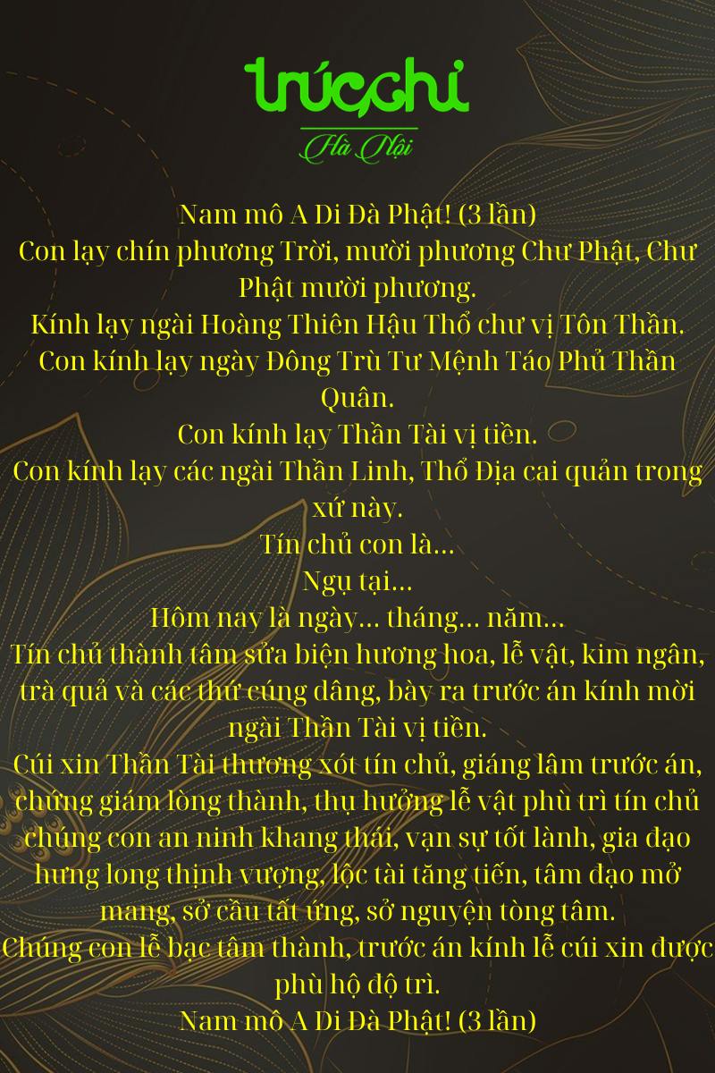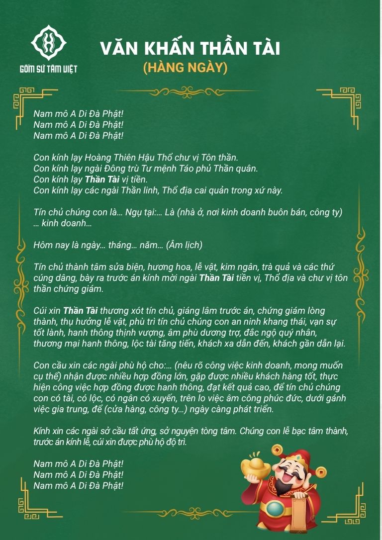 Bài khấn đơn giản mà linh nghiệm, được thực hiện từ 5h đến 7h, là thời điểm lý tưởng để đón nhận vận khí. Qua từng lời cầu nguyện, biệt tăm khổ cực trong công việc được xua tan, và niềm tin vào thành công ngày càng vững chắc hơn. Thật sự, nghi thức này không chỉ là thói quen mà còn là một phần không thể thiếu của người kinh doanh, giúp kết nối với những giá trị tâm linh tốt đẹp.