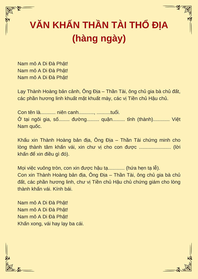 Mỗi sáng sớm, khi ánh nắng đầu tiên chiếu rọi, những hộ kinh doanh lại tấp nập trong việc chuẩn bị lễ cúng cho Ông Địa và Thần Tài. Bài khấn được xem như cầu nối giữa con người với thần linh, nơi gửi gắm lòng thành khẩn và mong ước làm ăn phát đạt. Con xin Thành Hoàng bản địa, Ông Địa – Thần Tài, làm chứng cho tấm lòng của mình, xin chư vị hiện diện và gia hộ cho mọi việc trong ngày mới.