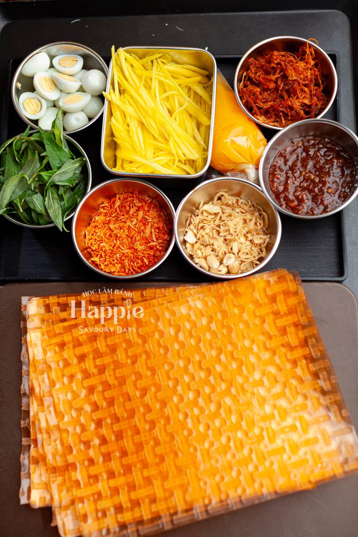 Khi đã chuẩn bị xong bánh tráng, hãy lần lượt cho các nguyên liệu vào. Đầu tiên là một lớp sốt bơ, sau đó là những quả trứng cút đã luộc chín, khô mực xé sợi, cùng với rau răm và xoài xanh nạo sợi. Những nguyên liệu này sẽ tạo ra sự kết hợp hương vị tuyệt vời.