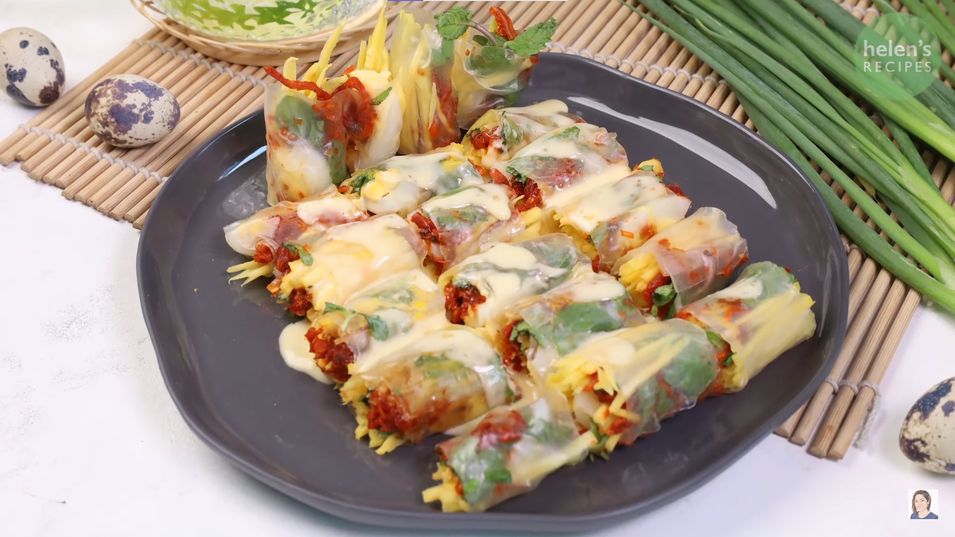 Sau đó, hãy rắc thêm các thành phần như trứng cút, mực khô xé sợi và rau xanh lên bánh. Cuộn lại thật chặt tay và cắt thành từng miếng vừa ăn. Khi thưởng thức, bạn sẽ cảm nhận được vị dai dai của bánh, thơm lừng của trứng và vị béo ngậy từ sốt bơ, chắc chắn sẽ khiến bạn bị hút hồn ngay từ miếng đầu tiên.