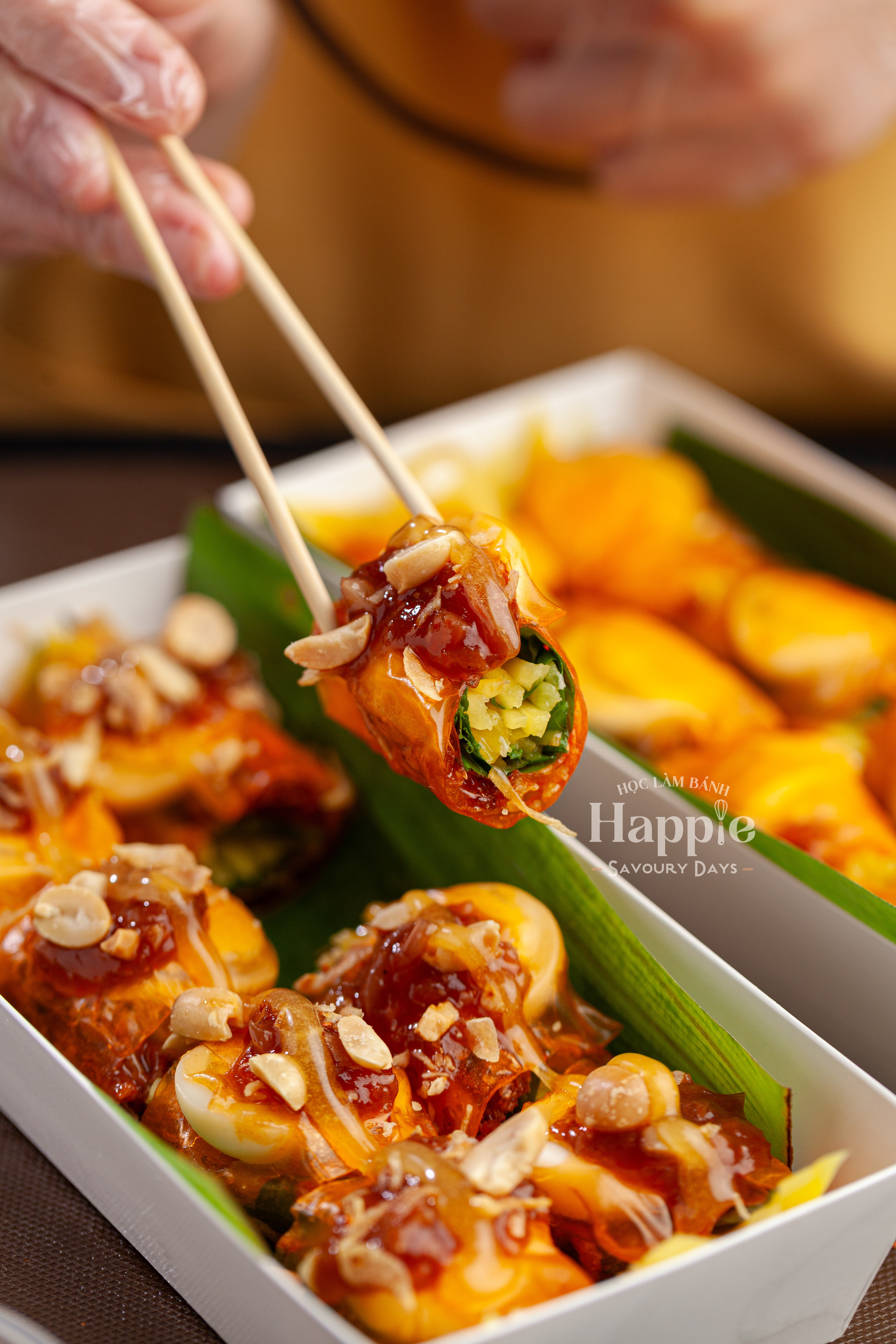 Cuối cùng, nhẹ nhàng cuốn bánh tráng lại và thưởng thức với sốt me hoặc nước chấm yêu thích. Không chỉ ngon, bánh tráng cuốn còn mang đến cảm giác thú vị và đầy sáng tạo trong từng cuộn bánh.