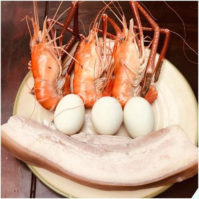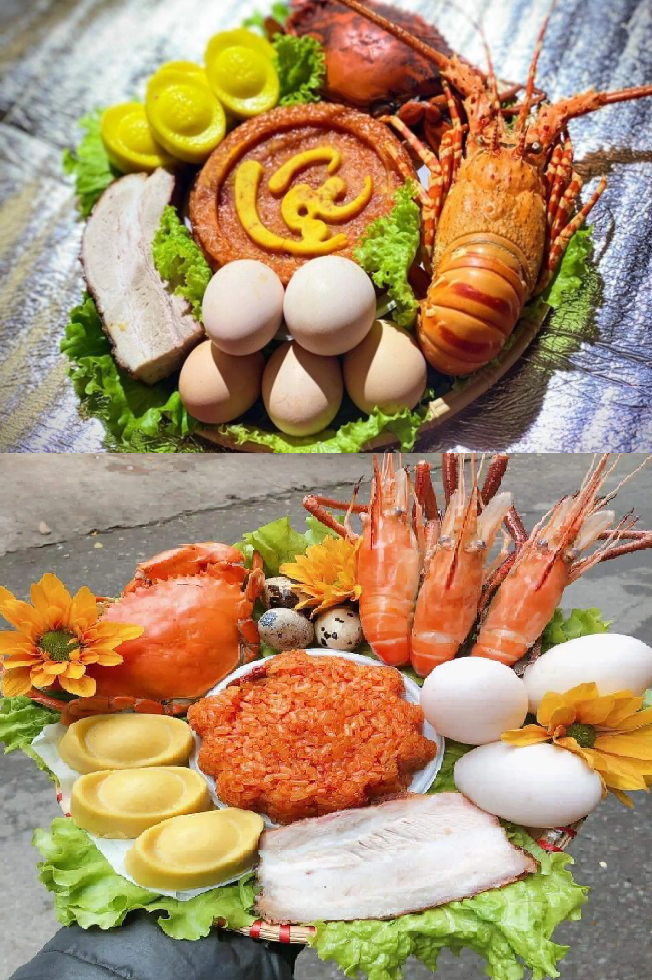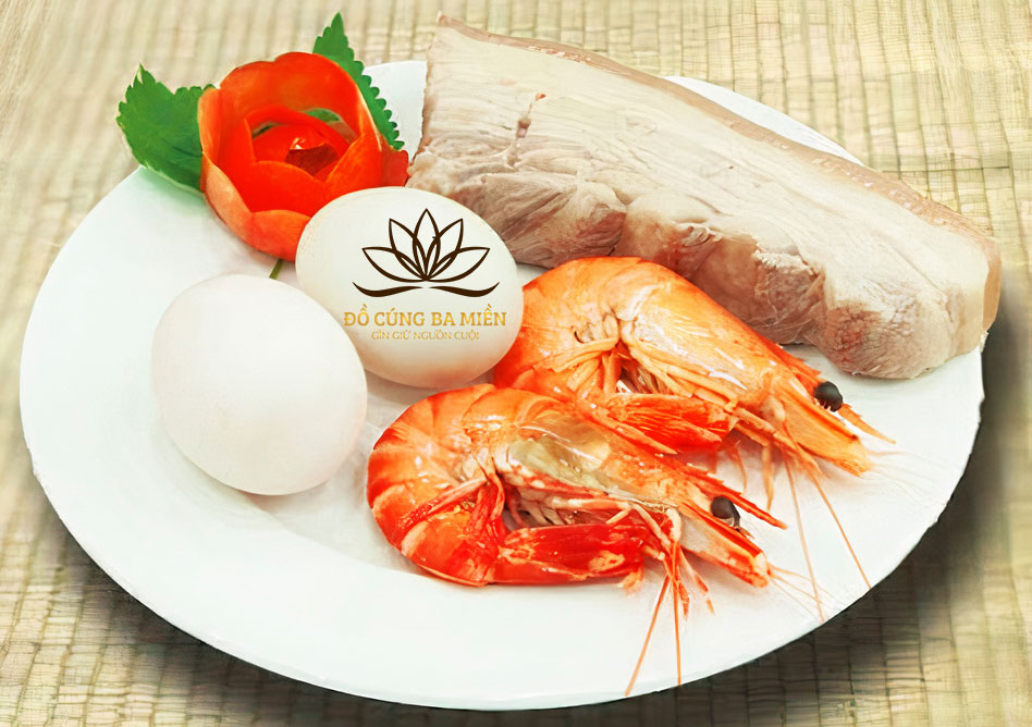 Miếng thịt heo ba chỉ luộc đại diện cho yếu tố Thổ, là biểu tượng cho sự vững chãi và bền bỉ. Trứng, có thể là trứng gà hoặc trứng vịt, không chỉ tròn trịa mà còn tượng trưng cho sự sinh sôi, nảy nở, biểu hiện cho Thiên. Cuối cùng, tôm hoặc cua luộc đại diện cho Thủy, mang đến sự trong lành và phong phú.