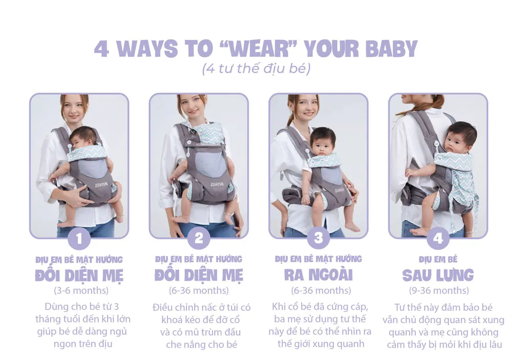 Ngoài ra, tư thế địu trước ngực sẽ an toàn hơn khi bé còn nhỏ. Hãy để bé quay mặt vào lòng mẹ, không chỉ giúp bé cảm thấy gần gũi mà còn đảm bảo an toàn hơn trong quá trình di chuyển. Đừng quên sử dụng chất liệu vải mềm mại để đảm bảo thoải mái cho làn da nhạy cảm của bé nhé!