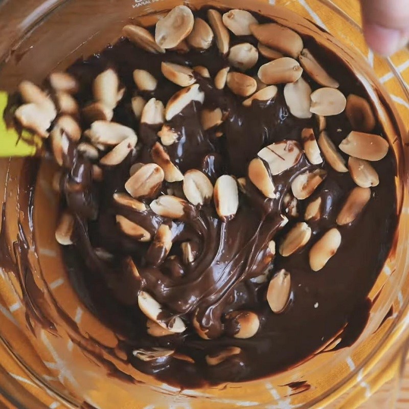 Bước tiếp theo là đun chảy socola. Bạn có thể sử dụng những miếng socola đen chất lượng cao, và chỉ cần ba nguyên liệu chính: vụn socola đen, vụn bơ đậu phộng, cùng với đậu phộng muối đã rang. Món này có thể thực hiện bằng lò vi sóng hoặc nồi nấu chậm, rất tiện lợi cho những ai bận rộn.