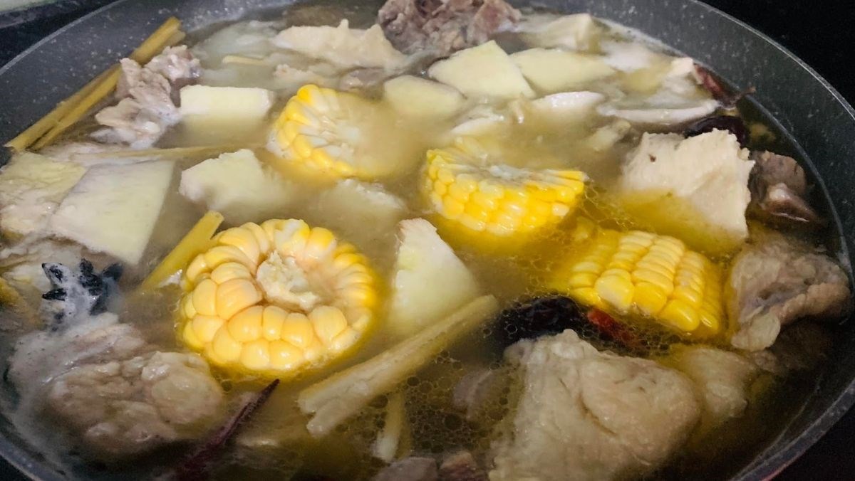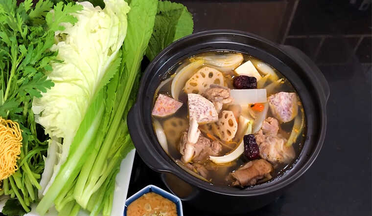 Sau khi chuẩn bị thịt, bạn bắt tay vào nấu nước dùng. Đun sôi một nồi nước lớn rồi cho các gia vị như sả, gừng vào ninh khoảng 30 phút cho ngọt. Thêm vào nước dừa tươi để nước dùng thơm hơn nhé. Đừng quên cho các nguyên liệu khác như khoai môn, củ sen và nấm hương vào nấu cùng để thêm phần hấp dẫn.