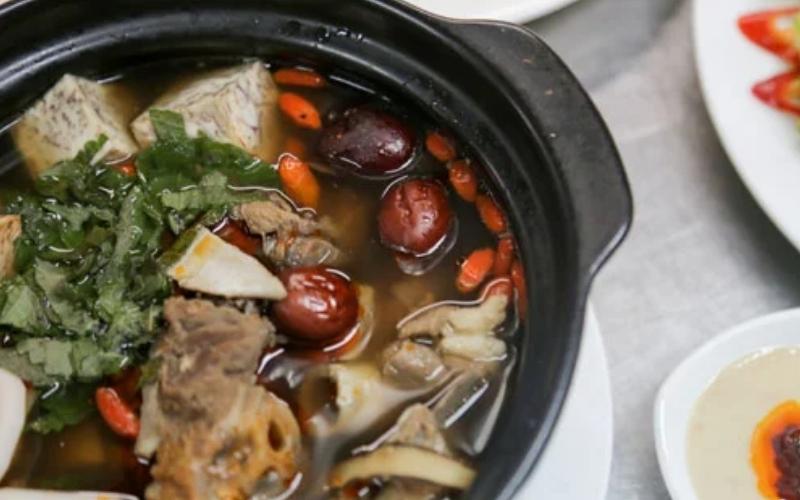 Bước tiếp theo là nấu nước dùng. Bạn chỉ cần đun sôi nồi nước lớn, sau đó cho xương dê và thịt vào, thêm táo đỏ và ớt khô để nước dùng thêm phần ngọt và đậm đà. Hãy nêm nếm gia vị một cách hợp lý để tạo nên hương vị hoàn hảo. Khoảng 30 phút sau, khi nước dùng đã ngấm thì cho khoai môn và củ sen vào nấu chung.