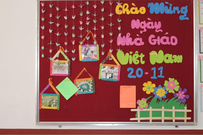 Không thể thiếu những tấm poster với lời chúc gửi đến các thầy cô. Các bức ảnh tập thể cùng thầy cô cũng sẽ tạo thêm không khí thân thương. Trang trí xung quanh bảng với hoa giấy, lá cờ nhỏ và thiệp ghi lời chúc không chỉ giúp tạo điểm nhấn mà còn thể hiện tình cảm chân thành của mỗi học trò.