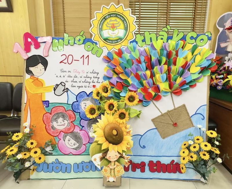 Một trong những ý tưởng đơn giản mà hiệu quả là sử dụng hoa tươi. Bạn có thể bố trí những bó hoa nhỏ trên bàn giáo viên hoặc treo lên tường. Thêm vào đó, bóng bay cũng là một điểm nhấn tuyệt vời, giúp lớp học trở nên vui tươi hơn. Bạn nên chuẩn bị giấy màu, decal sáng tạo, và thậm chí là hình dán 3D dễ thương để trang trí bảng lớp. Những hình ảnh như sách, hoa, hoặc biểu tượng thầy cô sẽ làm nổi bật chủ đề của ngày lễ.