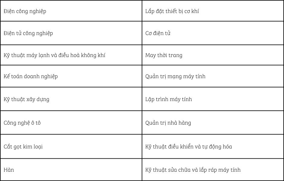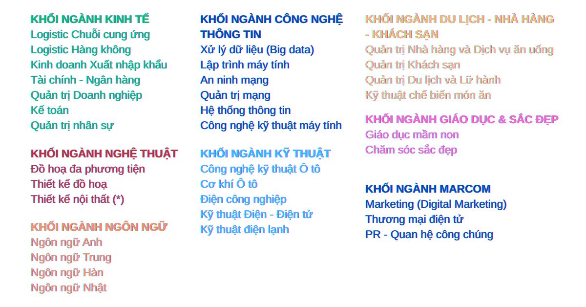 Khi quyết định theo học tại các trường cao đẳng, nhiều bạn trẻ thường băn khoăn không biết có những ngành học nào phù hợp với sở thích và nhu cầu của mình. Hiện nay, hệ thống các ngành nghề đào tạo ở bậc cao đẳng rất đa dạng, đáp ứng tốt nhu cầu của thị trường lao động và giúp sinh viên dễ dàng lựa chọn hướng đi phù hợp. Bài viết dưới đây sẽ giới thiệu danh sách các ngành học ở trường cao đẳng, những ngành nghề được nhiều người quan tâm, cũng như các nhóm ngành dễ xin việc. Ngoài ra, chúng tôi sẽ đưa ra một số lời khuyên hữu ích giúp bạn chọn ngành phù hợp khi đăng ký học cao đẳng.