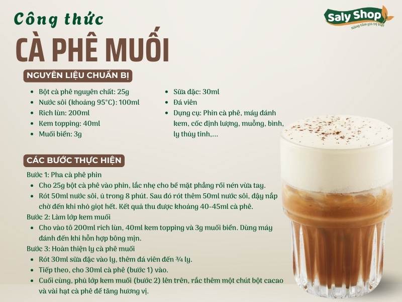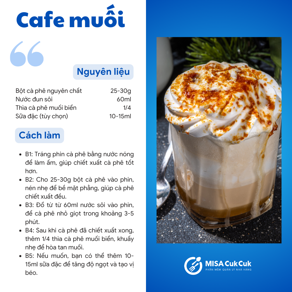 Cà phê muối là một biến tấu độc đáo và mới lạ từ cách thưởng thức cà phê truyền thống, mang đến trải nghiệm hương vị đầy cuốn hút với sự kết hợp giữa vị đắng của cà phê, vị béo của sữa và chút mặn nhẹ từ muối. Trong bài viết này, chúng ta sẽ cùng khám phá công thức, cách làm cà phê muối chuẩn vị, tìm hiểu nguyên liệu, tỷ lệ pha chuẩn, những bí quyết để tạo nên ly cà phê muối thơm ngon và nghệ thuật thưởng thức đặc biệt. Ngoài ra, các lưu ý khi pha, hàm lượng calo và tác dụng của cà phê muối cũng sẽ được bật mí đầy đủ.