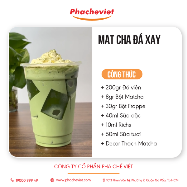 Công thức làm Matcha đá xay là một trải nghiệm thú vị cho những ai yêu thích hương vị trà xanh. Để bắt đầu, bạn cần chuẩn bị một số nguyên liệu như 8 gram bột matcha Nhật, 30 gram bột frappe, 40ml sữa đặc, 50ml sữa tươi và 200 gram đá viên. Dĩ nhiên, bạn cũng đừng quên thạch matcha để tăng thêm sự hấp dẫn cho món uống này!
