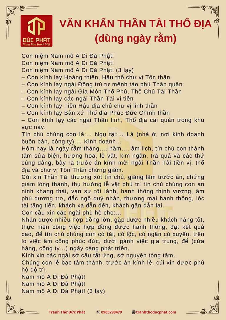 Vào ngày rằm hàng tháng, việc cúng thần Tài trở thành một nét truyền thống quan trọng đối với những gia đình kinh doanh. Đây là dịp để bày tỏ lòng thành kính đối với các vị thần linh, cầu mong sự thuận lợi và phát đạt. Văn khấn cúng thần Tài thường bắt đầu bằng những lời nguyện cầu trang trọng, với sự kính cẩn hướng về chín phương trời và mười phương Phật.