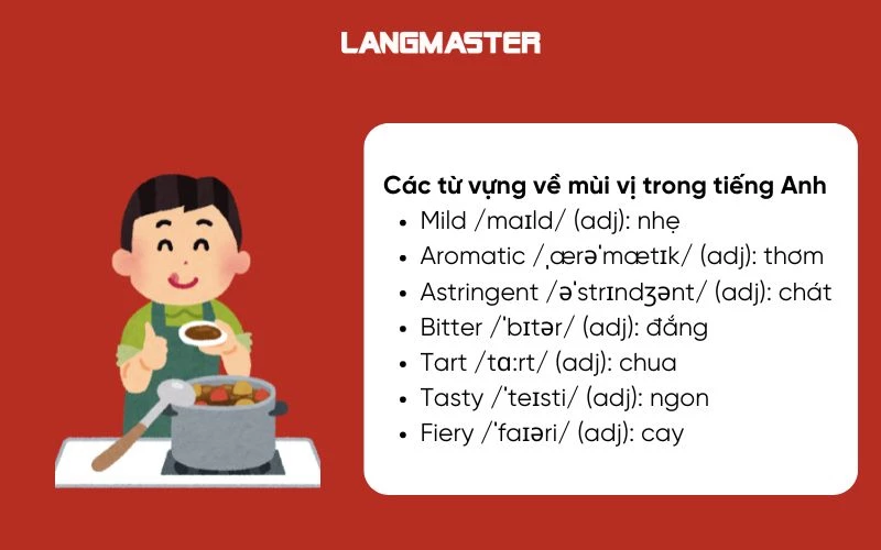 Khi nói về gia vị trong nấu ăn, từ vựng tiếng Anh là một phần không thể thiếu giúp chúng ta diễn tả được sự phong phú của hương vị. Ví dụ, từ “aromatic” chỉ những gia vị thơm, trong khi “astringent” mô tả một vị hơi chát, như trong trường hợp của các loại trái cây hay thảo mộc.