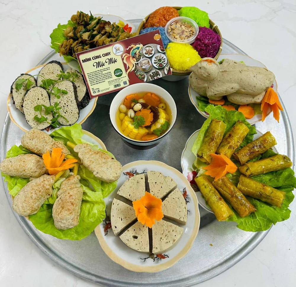Mâm cỗ chay luôn mang trong mình sự bình dị nhưng lại rất ý nghĩa. Một mâm cỗ chay đơn giản nhưng đầy đủ có thể bao gồm nem chay chiên xù, chả đậu phụ, và đậu phụ bao bố. Đặc biệt, món canh củ quả hầm nấm hương và hạt sen không chỉ thơm ngon mà còn rất bổ dưỡng. Giò chả chay kết hợp với xôi đậu tạo nên bữa ăn hoàn hảo, thanh đạm nhưng vẫn tinh tế.