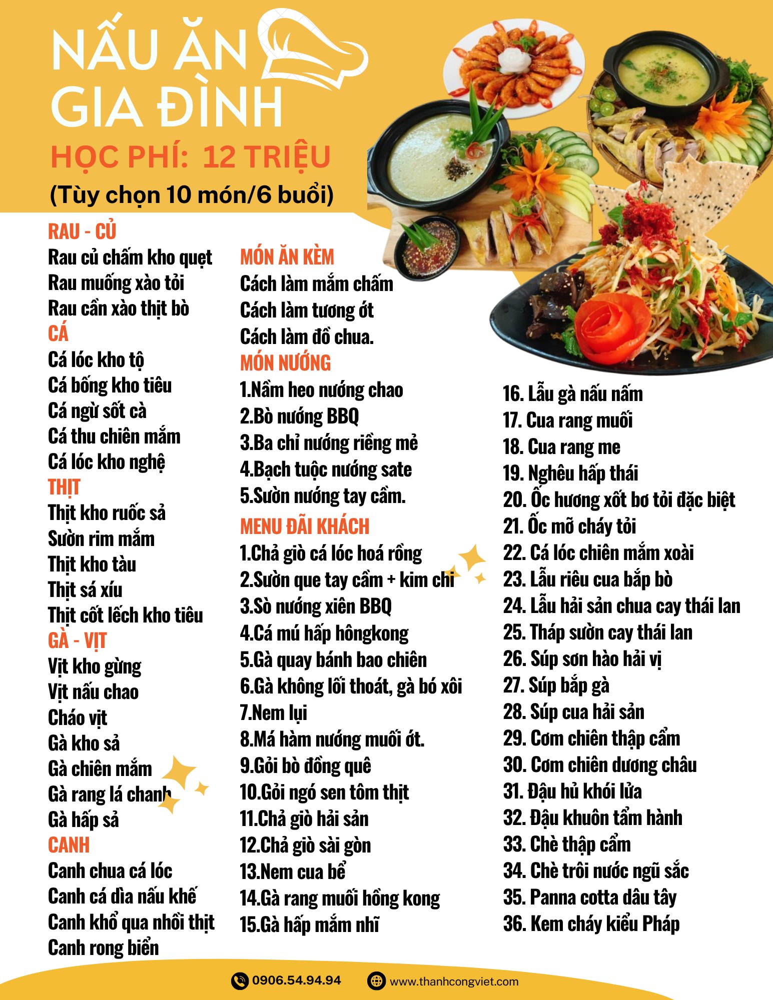 Học phí là 12 triệu đồng, bao gồm nguyên liệu thực hành, giáo trình và đồng phục. Hãy nhanh tay đăng ký để cùng chúng tôi biến nấu ăn thành niềm vui mỗi ngày và tạo nên những kỷ niệm đáng nhớ bên bữa cơm gia đình. Tham gia khóa học, chắc chắn bạn sẽ tự tin hơn khi đứng trước bếp!