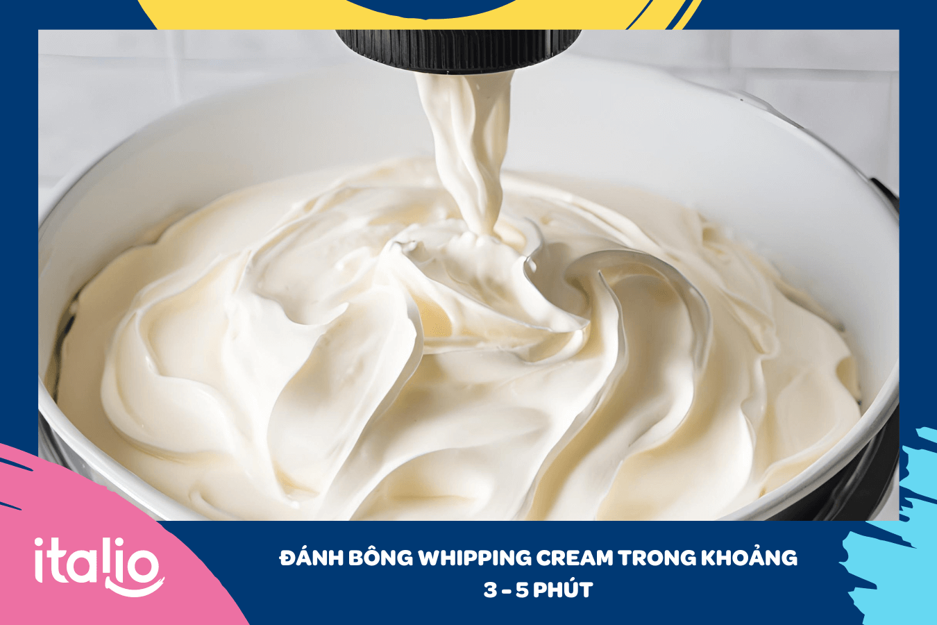 Tiếp theo, quy trình đánh bông là một bước không thể thiếu. Bạn nên chuẩn bị một tô lớn và cho khoảng 500ml whipping cream vào đó. Sử dụng máy đánh trứng, đánh ở tốc độ cao khoảng 2-3 phút cho đến khi kem bông nhẹ nhưng có độ đặc.