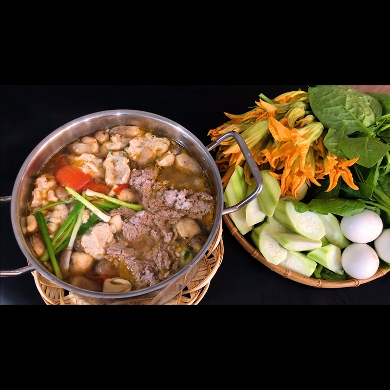 Quy trình nấu lẩu khá đơn giản. Đầu tiên, bạn hầm xương ống với nước cho ra vị ngọt tự nhiên. Tiếp theo, làm riêu cua bằng cách xay nhuyễn cua đồng cùng thịt xay và trứng vịt. Khi nước dùng đã đủ màu sắc và hương vị, bạn cho riêu vào nồi.