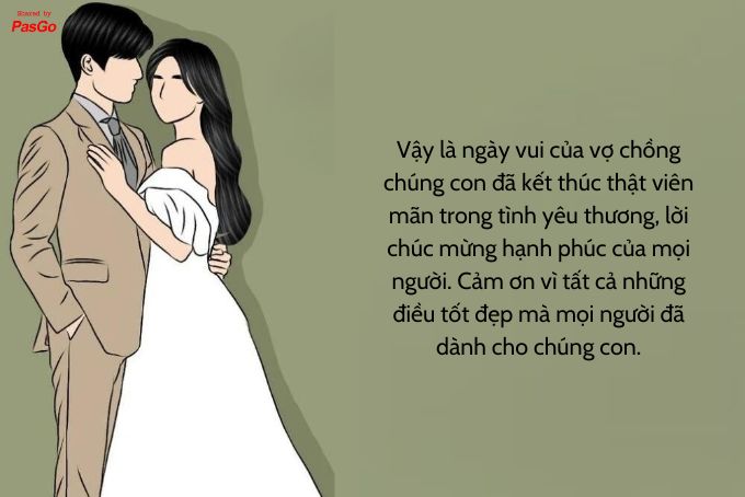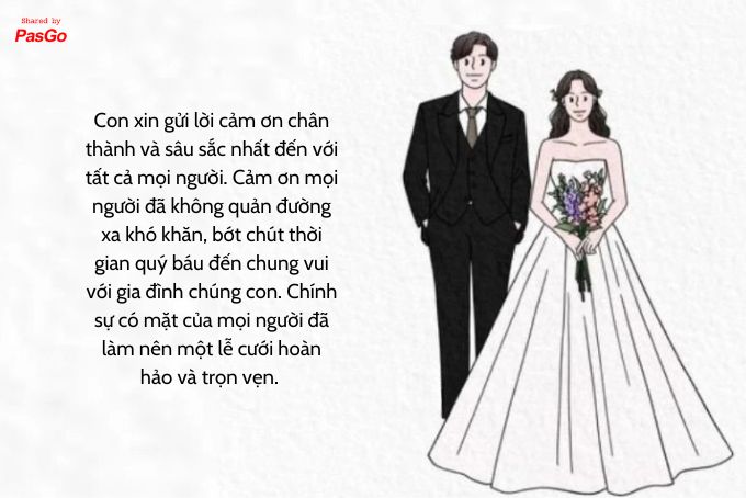 Nếu trong lễ cưới có gì thiếu sót, mong mọi người bỏ qua cho chúng con. Chúng con vô cùng trân quý sự hiện diện của tất cả mọi người và hy vọng rằng mọi người sẽ luôn khỏe mạnh, hạnh phúc. Cuối cùng, xin cảm ơn mọi người một lần nữa vì đã cùng chia sẻ niềm hạnh phúc này với gia đình chúng con.