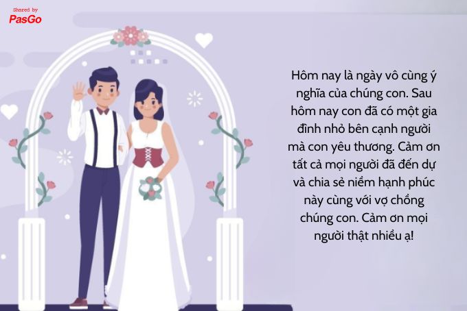 Trong ngày trọng đại của cuộc đời, lễ cưới của chúng con đã diễn ra thật ấm cúng và hạnh phúc. Thay mặt vợ chồng con, chúng con xin chân thành cảm ơn bố mẹ hai bên đã dày công tổ chức để chúng con có một ngày cưới đáng nhớ. Những giây phút vui vẻ bên gia đình, bạn bè đã khiến ngày hôm ấy trở nên ý nghĩa hơn bao giờ hết.