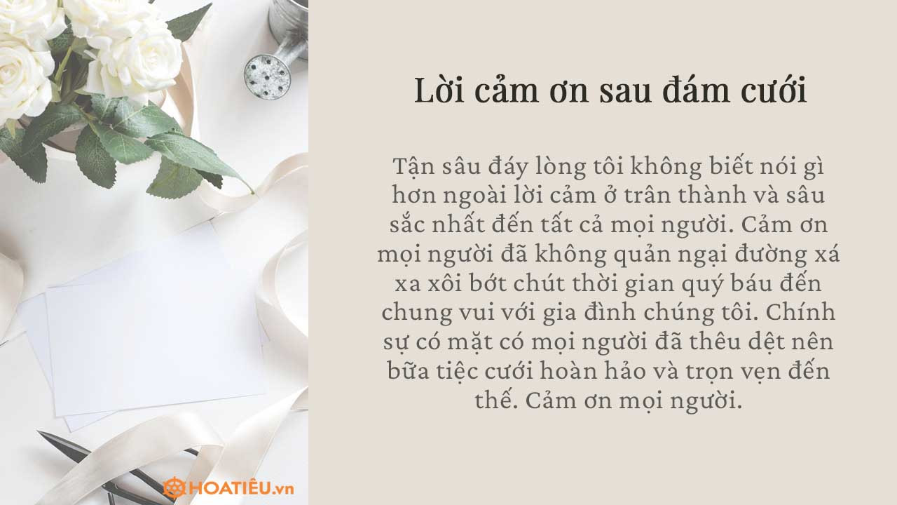Hôm nay, trong ngày trọng đại của chúng con, con xin gửi lời cảm ơn chân thành đến tất cả các vị khách mời đã dành thời gian đến tham dự buổi lễ cưới của mình. Sự hiện diện của mọi người đã làm cho ngày vui của chúng con trở nên trọn vẹn và ấm áp hơn rất nhiều.