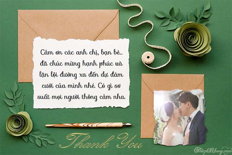 Nếu trong lễ cưới có điều gì thiếu sót, mong các vị khách quý hãy bỏ qua cho chúng con. Sau khi mọi thứ đã sắp xếp xong xuôi, chúng con mới có dịp ngồi lại để viết những lời cảm ơn chân thành từ tận đáy lòng. Một lần nữa, chúng con xin cảm ơn tất cả!
