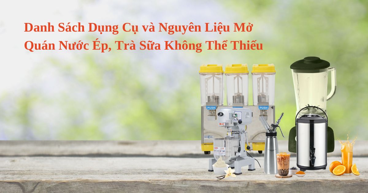 Để làm những ly sinh tố ngon miệng, máy xay sinh tố và máy ép trái cây là hai dụng cụ thiết yếu. Bạn cũng nên có một máy làm đá viên để đảm bảo có đủ đá cho các loại đồ uống lạnh. Không thể thiếu là các dụng cụ nhỏ như dao, thớt, ca đong và đồ nạo vỏ trái cây.