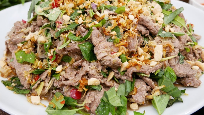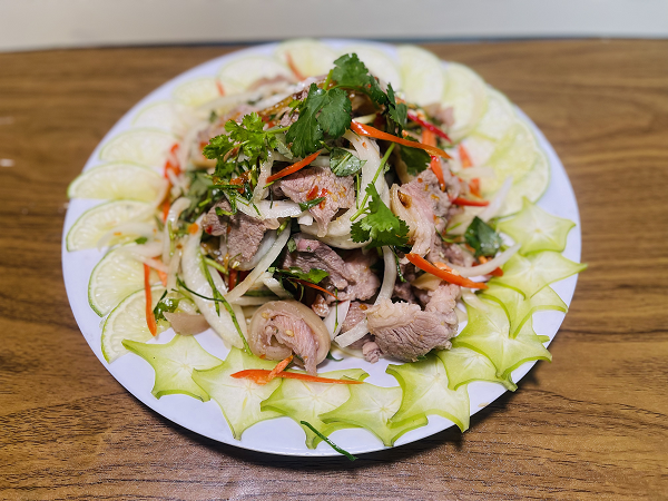 Bên cạnh đó, gỏi dê bóp thấu cũng là món không thể bỏ qua. Thịt dê được thái lát mỏng, trộn đều với hành tây, chuối chát, khế chua và các loại gia vị như ớt, tỏi, tạo nên tổng thể chua chua, ngọt ngọt, rất bắt miệng. Món ăn này thường được phục vụ cùng với nước mắm chua ngọt và chút đậu phộng rang giã nhỏ.