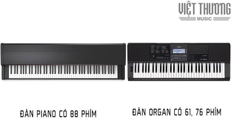 Piano và organ là hai loại nhạc cụ nổi bật với bàn phím, nhưng chúng có cấu tạo và đặc điểm khác nhau. Đàn piano tiêu chuẩn có 88 phím, bao gồm 52 phím trắng và 36 phím đen, cho phép người chơi thực hiện những bản nhạc phức tạp. Ngoài ra, một số loại piano đặc biệt có thể có tới 92 hoặc 97 phím. Trong khi đó, đàn organ thường có từ 61 đến 88 phím, với kích thước nhỏ hơn nhiều so với những cây piano fullsize.