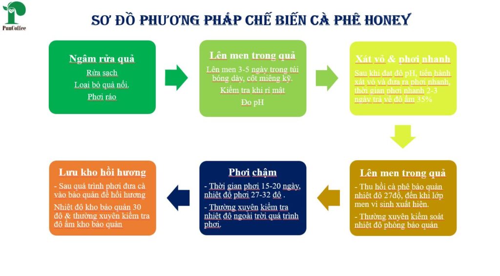 Quá trình lên men diễn ra tự nhiên nhờ các vi sinh vật có trong môi trường. Thường thì, nếu chỉ phơi dưới ánh nắng mặt trời, cà phê chế biến ướt sẽ cần từ 6 đến 7 ngày để khô hoàn toàn. Khi chọn phương pháp chế biến honey, thời gian này tăng lên 8-9 ngày.