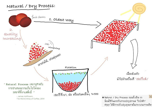 Phương pháp chế biến cà phê khô, còn được biết đến như là “Natural Process” hay “Dry Process”, là một trong những cách chế biến lâu đời và đơn giản nhất. Đầu tiên, những quả cà phê tươi sau khi thu hái sẽ được trải ra dưới ánh nắng mặt trời. Việc này không chỉ giúp giảm độ ẩm của cà phê mà còn tạo ra hương vị đặc trưng cho cà phê sau này.