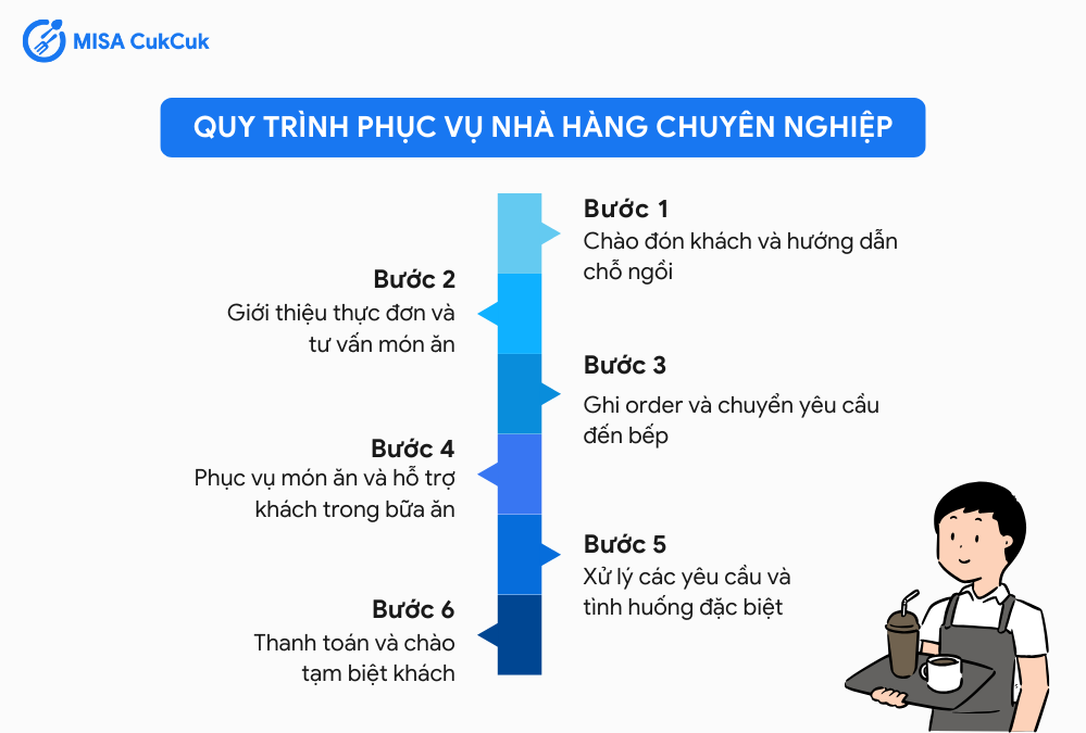 Quy trình phục vụ nhà hàng chính là nền tảng cơ bản cho mọi nhân viên phục vụ bàn. Sự chuyên nghiệp trong cách phục vụ không chỉ mang lại trải nghiệm tốt cho khách hàng mà còn góp phần quan trọng vào thành công của nhà hàng. Khi tuân thủ quy trình rõ ràng, từ chào đón khách, hướng dẫn chỗ ngồi đến giới thiệu thực đơn, mỗi bước đều giúp tăng tỷ lệ hài lòng của thực khách.