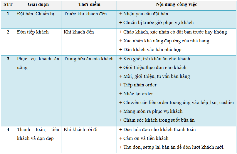 Cần lưu ý rằng, quy trình phục vụ không chỉ đơn thuần là các thao tác mà còn là cách tạo dựng mối quan hệ với khách hàng. Đều đặn, tận tâm trong từng bước từ phục vụ bàn đến phục vụ room service, tất cả đều hướng đến mục tiêu cuối cùng: sự hài lòng và trải nghiệm đáng nhớ cho khách hàng.