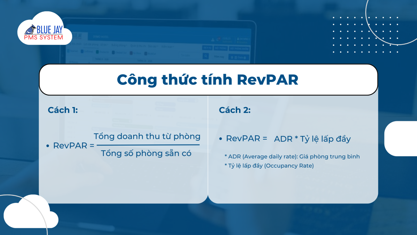 Một cách đơn giản để tính toán RevPAR là chia tổng doanh thu phòng cho tổng số phòng có sẵn hoặc nhân mức giá trung bình mỗi phòng (ADR) với tỷ lệ lấp đầy. Chỉ số này không chỉ phản ánh doanh thu thực tế mà còn cho thấy mức độ cạnh tranh so với các khách sạn khác trong cùng khu vực.