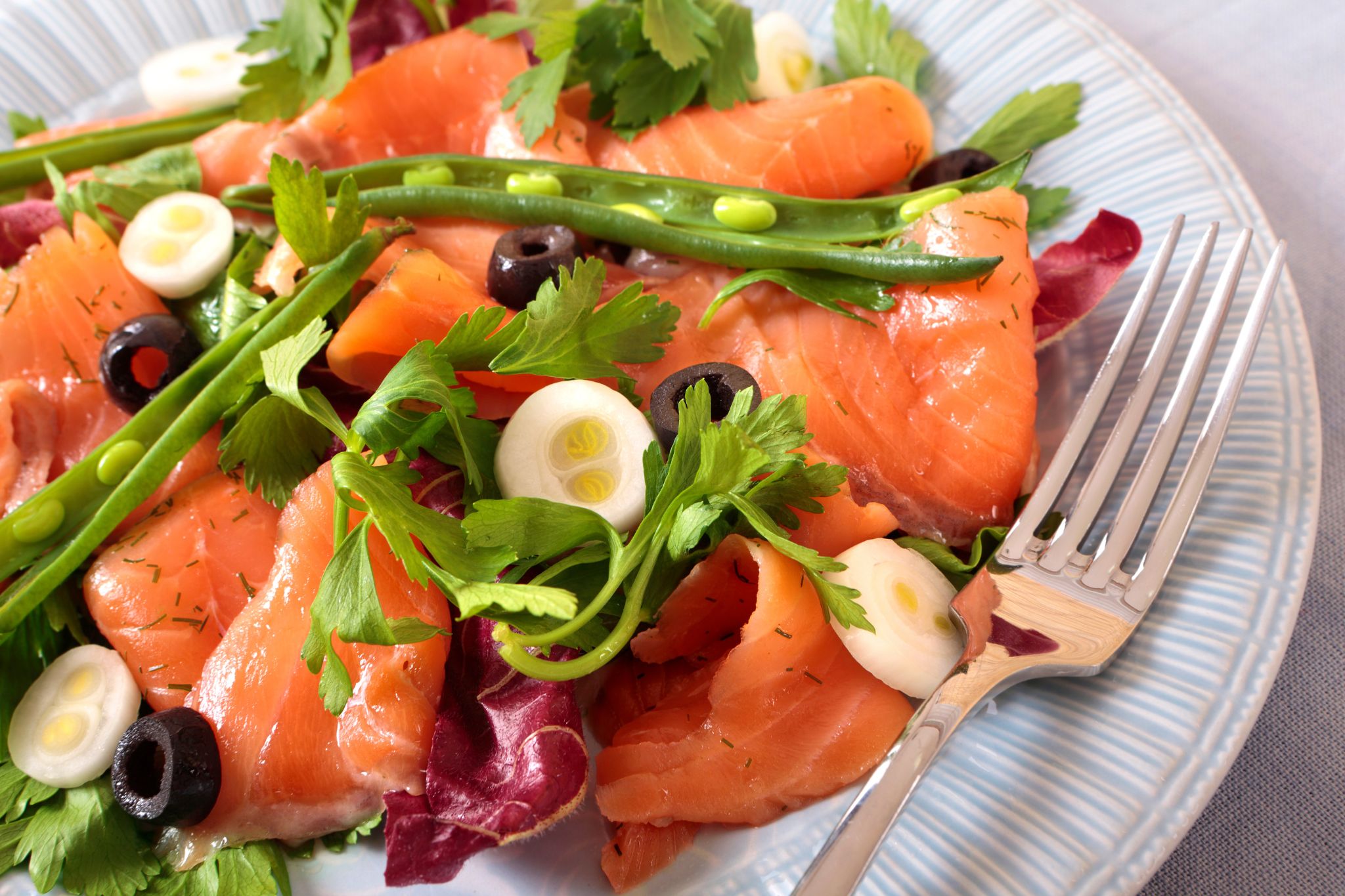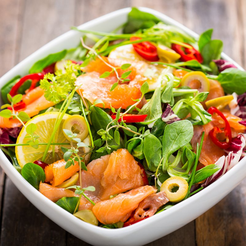 Cá hồi xông khói không chỉ thơm ngon mà còn giàu chất béo tốt như omega-3, giúp duy trì sức khỏe tim mạch cũng như tăng cường chức năng não bộ. Với lượng calorie thấp và nhiều protein, salad này sẽ làm bạn cảm thấy no lâu, hỗ trợ hiệu quả quá trình giảm cân.