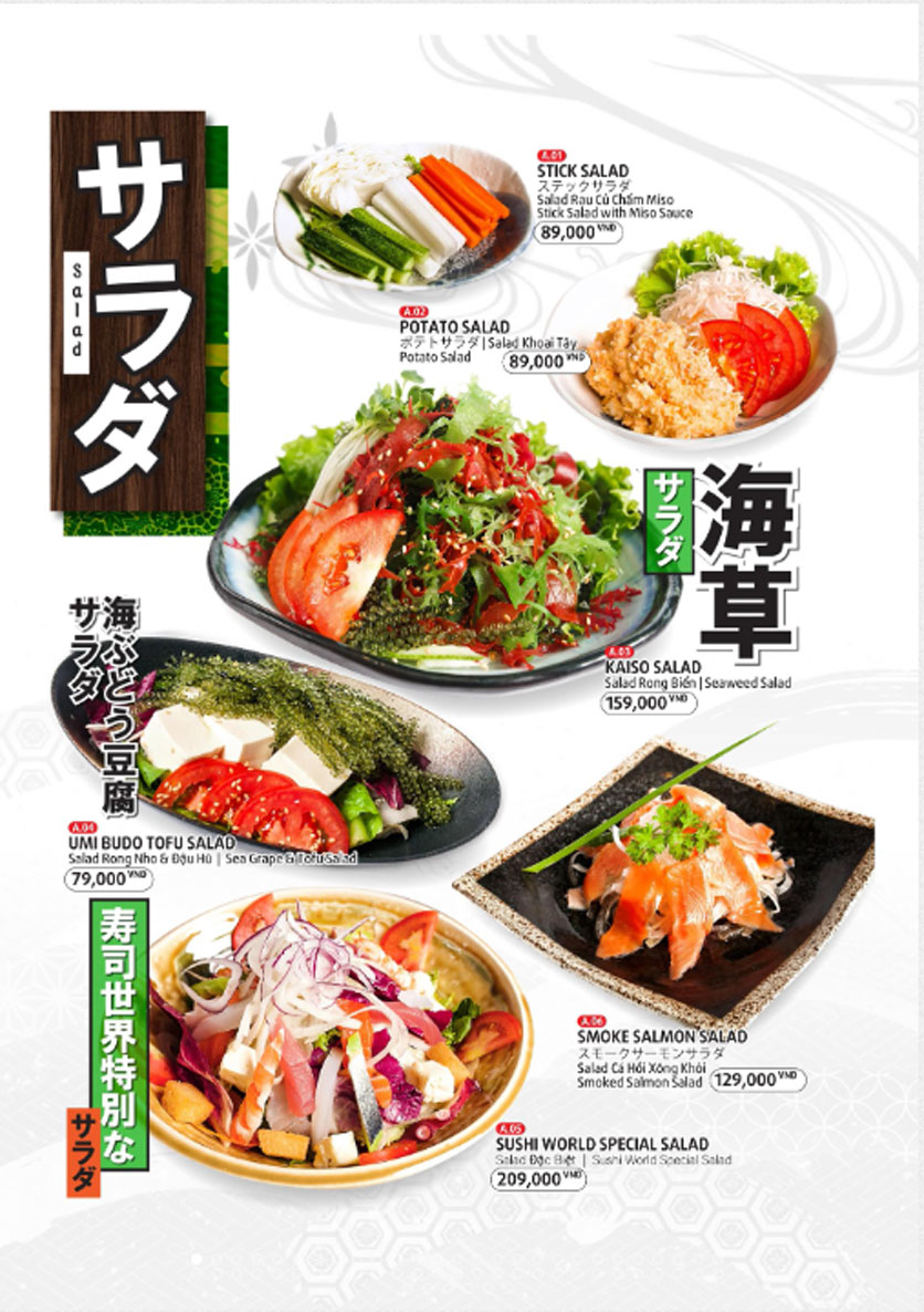 Tại đây, thực đơn rất đa dạng với những món ăn hấp dẫn như sushi, sashimi tươi ngon, BBQ và mì udon. Đặc biệt, cá hồi trong “SALMON FESTIVAL” đang được giảm giá lên đến 15%, là cơ hội tuyệt vời để trải nghiệm những món sashimi trứ danh. Nguyên liệu được nhập trực tiếp từ Nhật Bản, mang đến cho thực khách hương vị tinh tế từ đất nước mặt trời mọc.