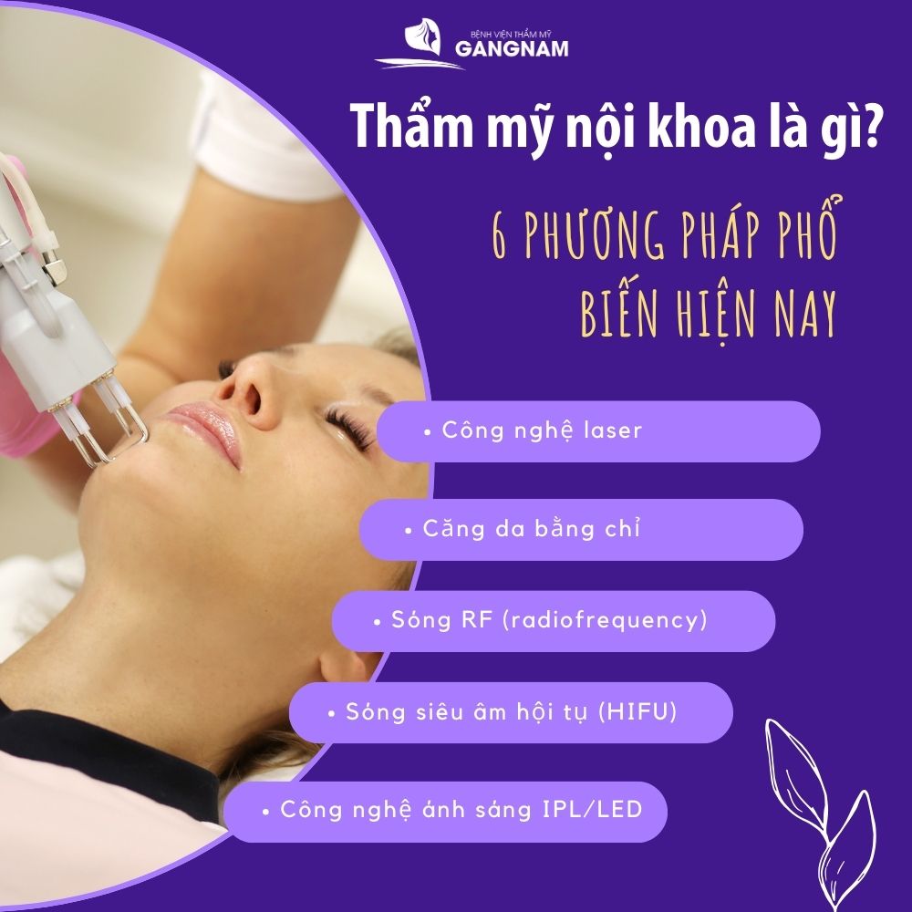 Trong thẩm mỹ nội khoa, các phương pháp như công nghệ laser, sóng RF, và lăn kim rất phổ biến. Những phương pháp này thường diễn ra trong thời gian ngắn, chỉ từ 15 đến 60 phút, giúp khách hàng tiết kiệm thời gian. Tuy nhiên, cần lưu ý rằng mỗi liệu trình đều có nguy cơ tiềm ẩn, do đó việc tuân thủ hướng dẫn của Bộ Y tế là rất cần thiết để giảm thiểu rủi ro và đảm bảo an toàn cho khách hàng.