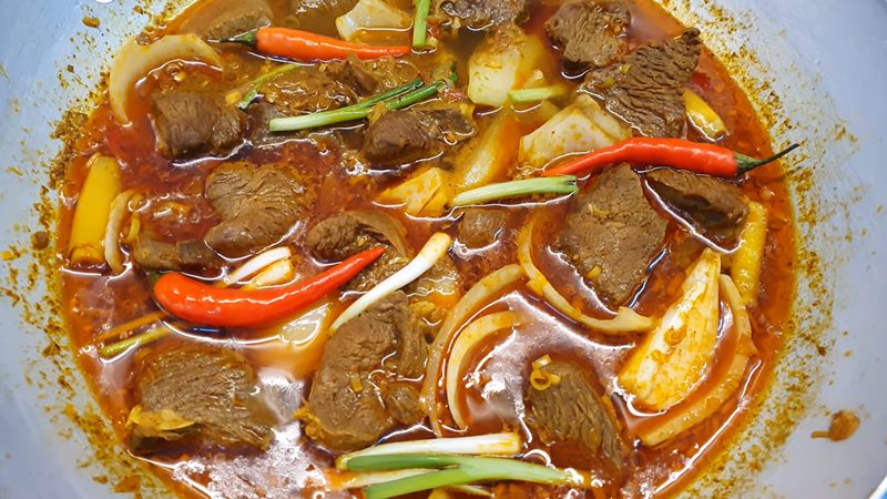 Cuối cùng, khi thịt đã chín tới, bạn cho hành tây, cà chua và cần tây vào xào chung khoảng vài phút. Món này thường được dùng kèm với cơm trắng hoặc bún, hứa hẹn sẽ mang đến cho gia đình bạn một bữa ăn thật ngon miệng và ấm áp.
