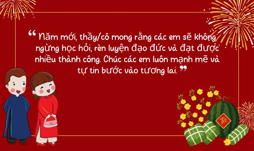 Trong những ngày đầu năm mới, lời chúc Tết không chỉ mang ý nghĩa cầu chúc sức khỏe và hạnh phúc mà còn là nguồn động lực cho học sinh trên con đường học tập. Những vần thơ ngắn gọn, ý nghĩa mang theo bao ước vọng, tạo nên không khí vui tươi, phấn khởi. Hãy để những câu thơ chúc Tết lan tỏa niềm vui, khuyến khích các em vững bước tiến về phía trước, tự tin chinh phục kiến thức và ước mơ của bản thân. Chúc cho năm mới, các em sẽ gặt hái được nhiều thành công, thắng lợi trong học tập và cuộc sống.