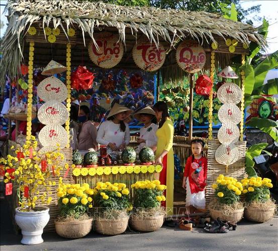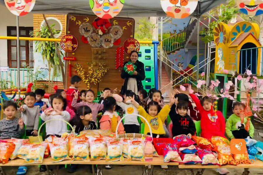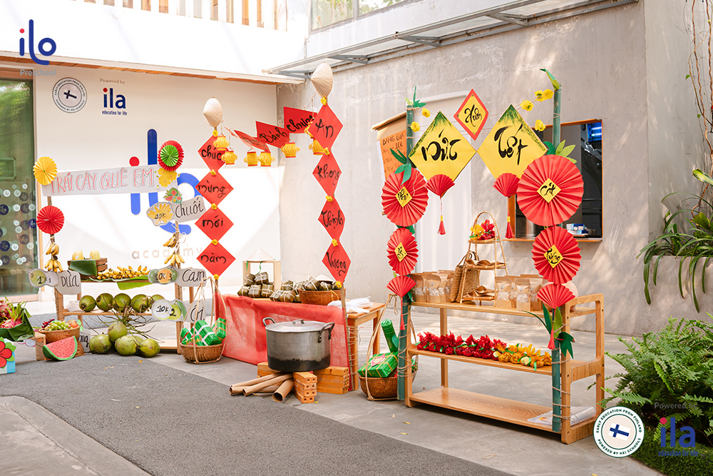 Gian hàng Tết không chỉ đơn thuần là nơi trưng bày mà còn là không gian để trẻ em học hỏi về phong tục tập quán của dân tộc. Những sản phẩm như giỏ mây đựng bánh chưng, mứt Tết hay hoa quả tươi được sắp xếp gọn gàng sẽ tái hiện lại không khí Tết truyền thống, gắn kết mọi thế hệ và mang đến giá trị tinh thần cho các em.