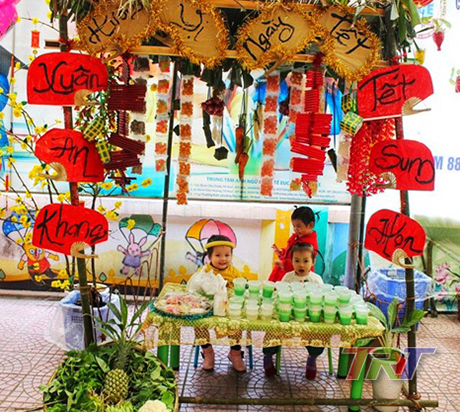 Trang trí gian hàng quà Tết cho trường mầm non là một hoạt động thú vị, giúp các bé trải nghiệm và hiểu rõ hơn về Tết cổ truyền của dân tộc. Những mô hình bánh chưng, bánh tét hay hoa đào, hoa mai sẽ tạo nên những góc nhìn sống động và đầy màu sắc, mang đến không khí Tết tràn ngập niềm vui cho các em nhỏ.