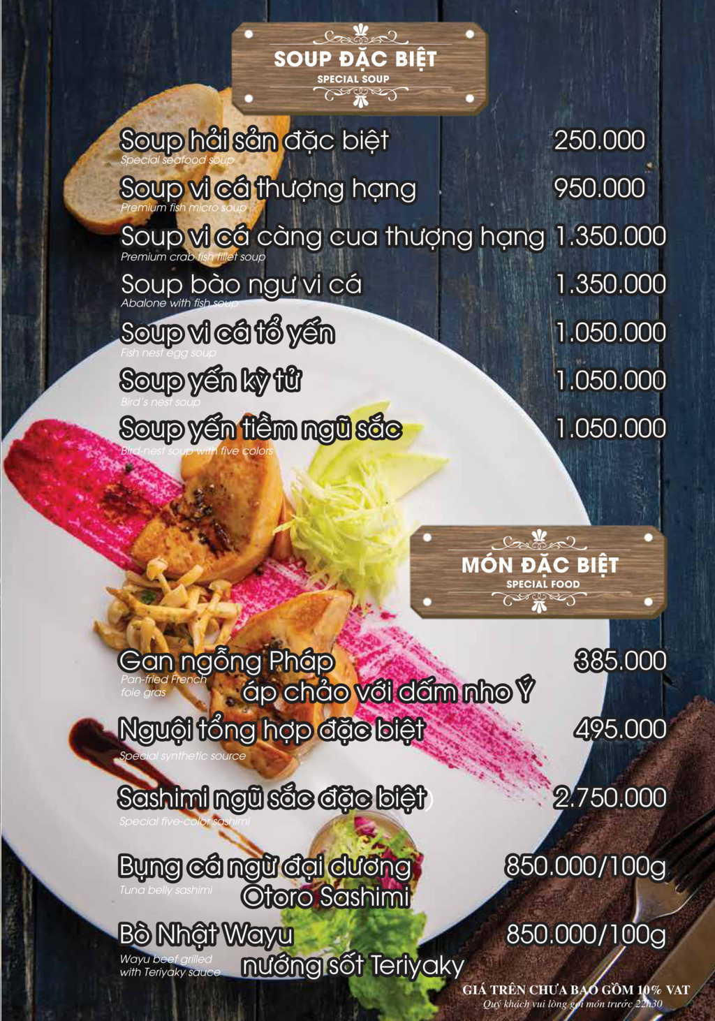 Thực đơn phục vụ cho mâm 6 người với mức giá khoảng 400.000 VNĐ/người, mang đến trải nghiệm tuyệt vời từ khai vị như salad bắp cải, súp rong biển hải sản đến các món chính đa dạng như lẩu hải sản đặc biệt, ốc hương, và sashimi tổng hợp. Đặc biệt, món bò ức nướng bàn đá sẽ khiến bạn không thể cưỡng lại.