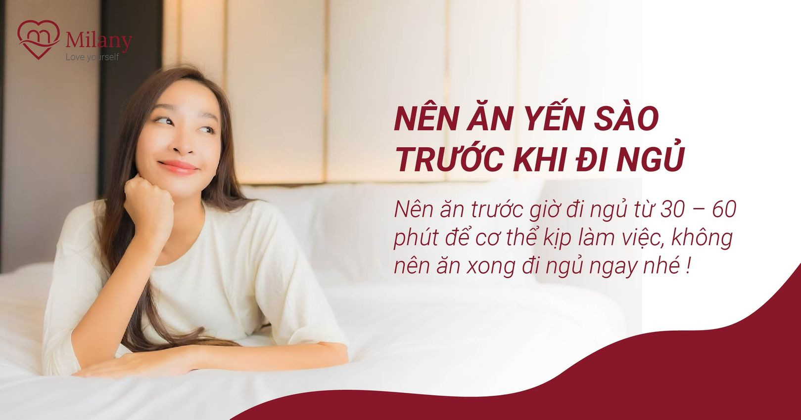 Ăn yến sào trước khi đi ngủ là một thói quen đáng để bạn thử nghiệm. Khi cơ thể bắt đầu nghỉ ngơi trong suốt đêm, quá trình trao đổi chất vẫn diễn ra. Việc bổ sung yến sào khoảng 1 tiếng trước khi nằm xuống có thể giúp cơ thể hấp thụ đầy đủ các dưỡng chất quý giá từ thực phẩm này.