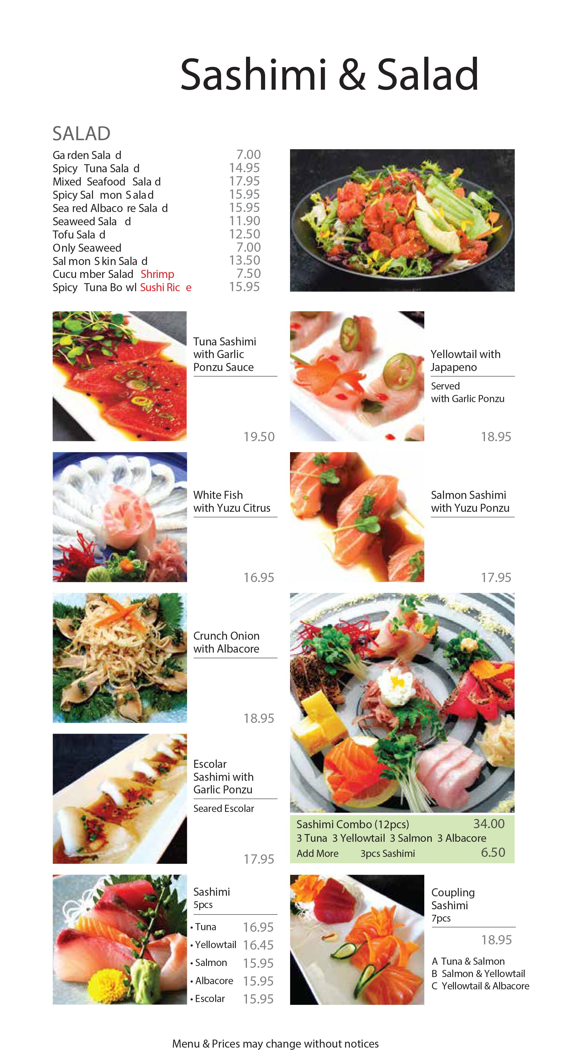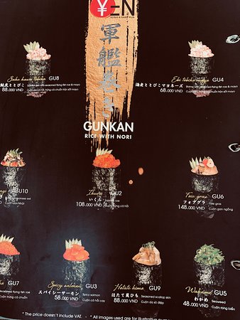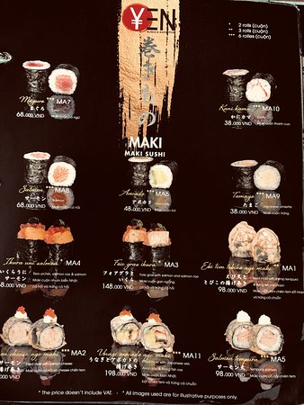 Yen Sushi & Sake Pub cam kết sử dụng nguyên liệu tươi ngon và chất lượng, phù hợp với phong cách fusion hiện đại. Đừng quên rằng giá menu chưa bao gồm VAT, và nhà hàng sẽ thu 8% VAT cùng 5% phí phục vụ.