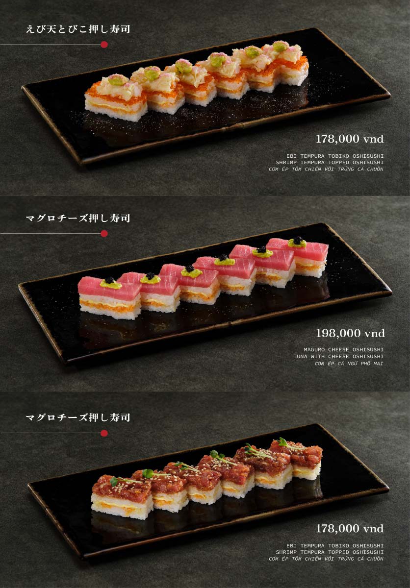 Không chỉ dừng lại ở đó, thực khách còn có thể thưởng thức trứng hấp hải sản hay trứng hấp gan ngỗng Pháp, những món ăn vừa quen thuộc nhưng cũng rất độc đáo. Đặc biệt, menu còn giới thiệu các món sushi đầy sáng tạo, như cơm cuộn lươn Nhật nướng với phô mai hay set cơm nắm sushi đặc biệt, chắc chắn sẽ khiến bạn hài lòng.